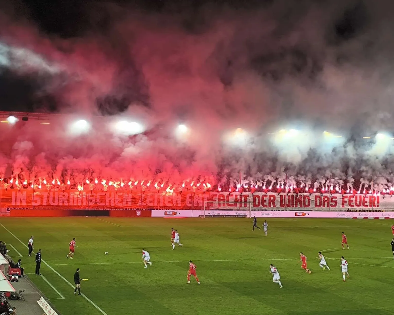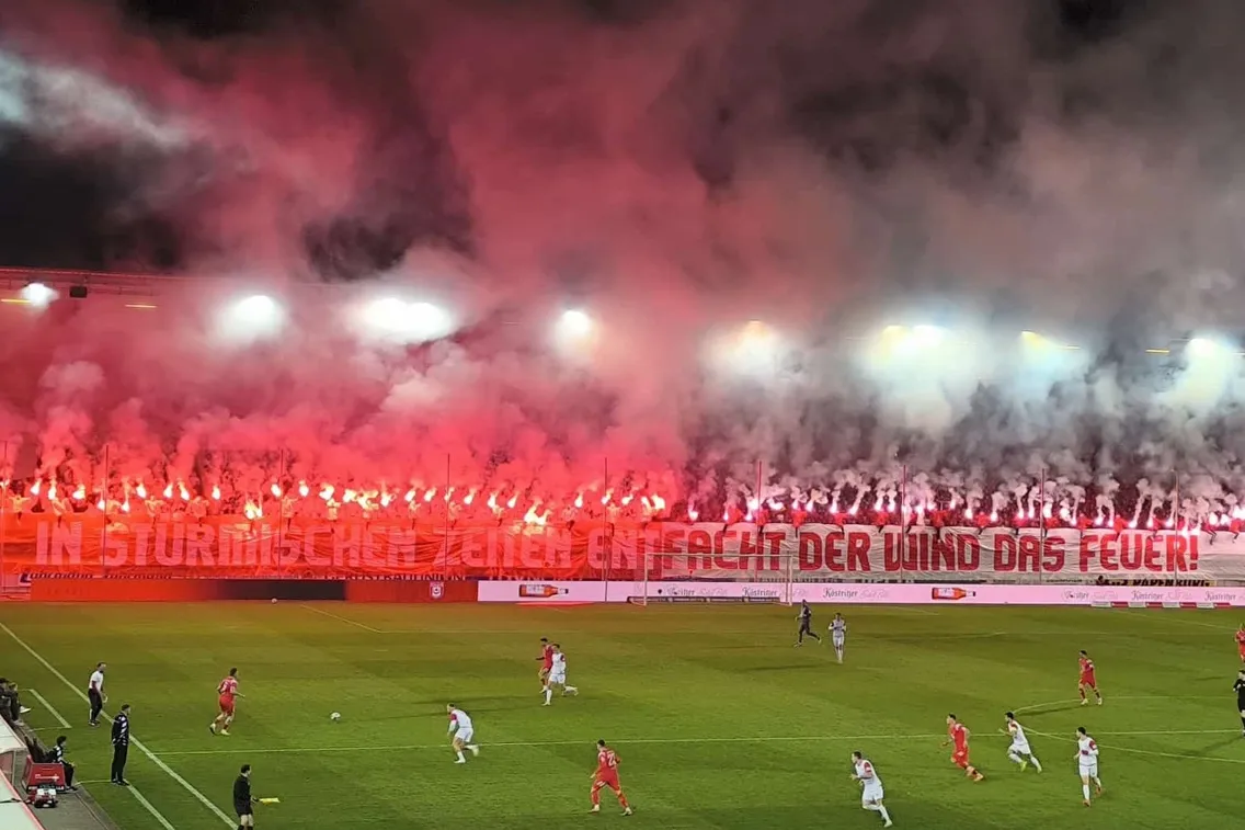 Schon vor dem Anpfiff war die Kulisse eines Spitzenspiels würdig. Auf den Rängen sorgten die Heimfans mit einer rot-weißen Choreo unter dem Motto „In stürmischen Zeiten entfacht der Wind das Feuer“ für Gänsehaut, auf dem Platz zeigte Halle anschließend genau die Entschlossenheit, die eine Spitzenmannschaft auszeichnet.